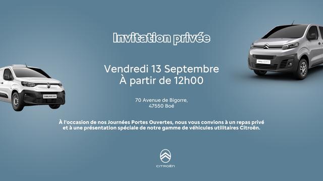 À l'occasion de la journée portes ouvertes, les membres du CABE 47 sont invités à la présentation des gammes Citroën Saint-Exupéry, Citroën utilitaires et Opel utilitaires suivie d'un repas privé. Invitation à l'initiative de notre amie cabiste Isabelle Rouhet, assistante commerciale VO.